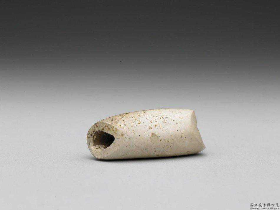 興隆洼文化至紅山文化早期玉管青綠玉質,已深沁成灰白色。孔徑不圓正,兩端亦不平齊。中孔或由兩面對鑽,或由單面鑿成。長2.8-7公分長2.8-7公分。國立故宮博物院。