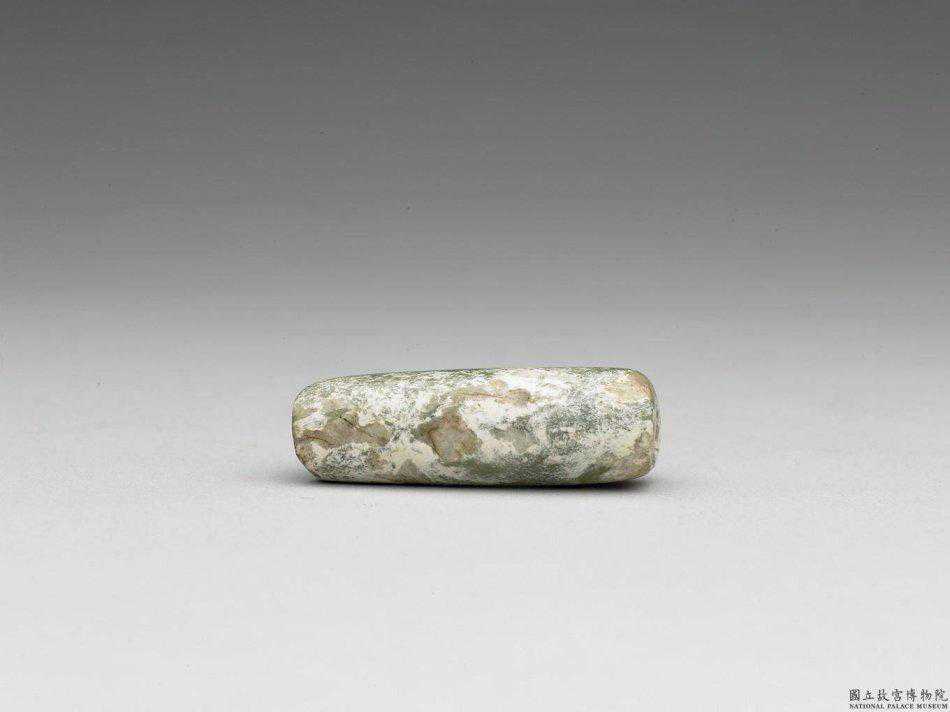 紅山文化玉斧。淺碧綠玉,一面尚稱勻淨,一面器表沁作灰白色。器厚重而無穿,應是被夾於木柄內使的,刃線平直而微帶圓弧狀。最寬7.9公分長20.5公分厚1.5公分。國立故宮博物院。