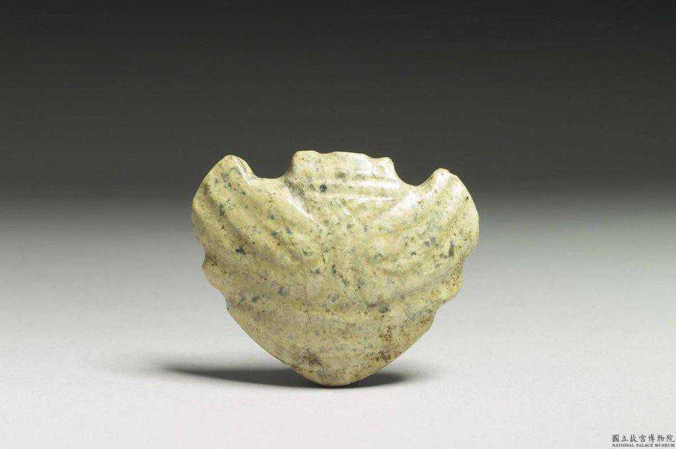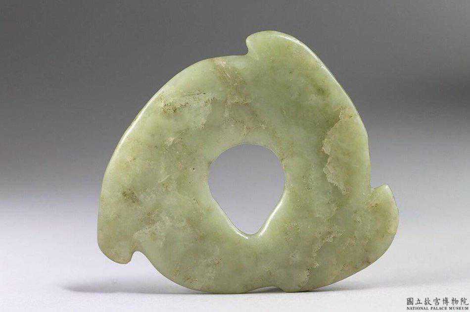 小珠山中層文化三牙璧綠色泛白玉質,有灰褐色雜斑和白綹,半透明。全器為圓形帶中孔,環周緣刻出三個牙,每個牙的大小、形狀不一;中孔作墜膽狀,中孔緣、外緣均磨薄。最長5.55公分孔徑1.38×1.67公分厚0.4-0.18公分。國立故宮博物院
