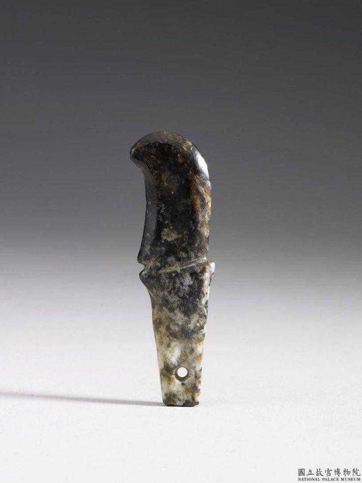紅山文化晚期勾形器墨色玉質,有裂痕與墨斑。勾形,中段有兩道凸棱,下有一穿孔。國立故宮博物院。
