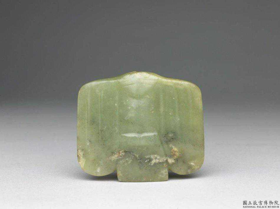 新石器時代弧形獸面紋玉珮碧綠色玉,因受沁表面都呈現大大小小的白斑。琢作一圓弧片狀,背面光素,正面淺浮雕一獸面,有角有耳。正中央上方有一小穿。由玉質及圓弧形的弧度看,可能是紅山文化的玉筒形器改雕的。寬7公分。國立故宮博物院。