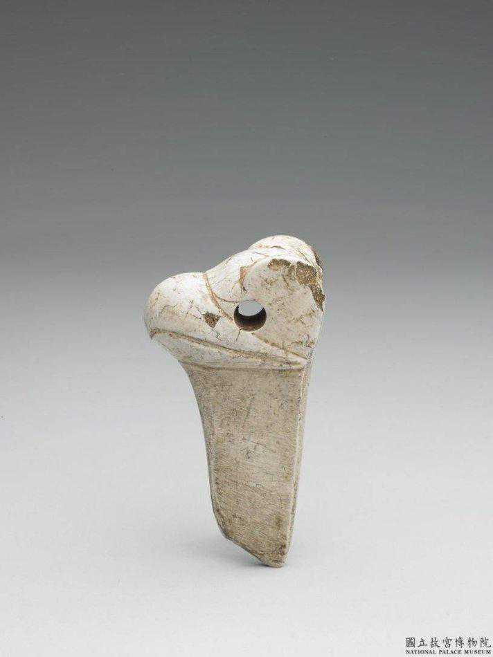 紅山文化晚期勾形器白玉帶大片墨斑,末端鑿兩孔,一孔穿透,一孔內凹未透。國立故宮博物院。