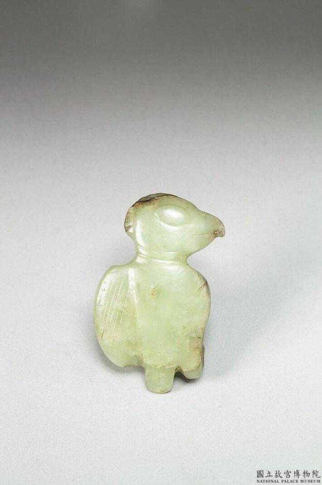 紅山文化晚期鳥形玉珮青綠玉,有微量黑點,局部赭沁。以淺浮雕線紋,勾勒出圓眼和翼部、尾部的平行飾紋等,為典型的紅山文化遺物,距今約五、六千年前。出土和傳世的紅山玉鳥多在3至5公分左右。此件寬達7.4公分,為難得的佳品。寬7.4公分。國立故宮博物院。
