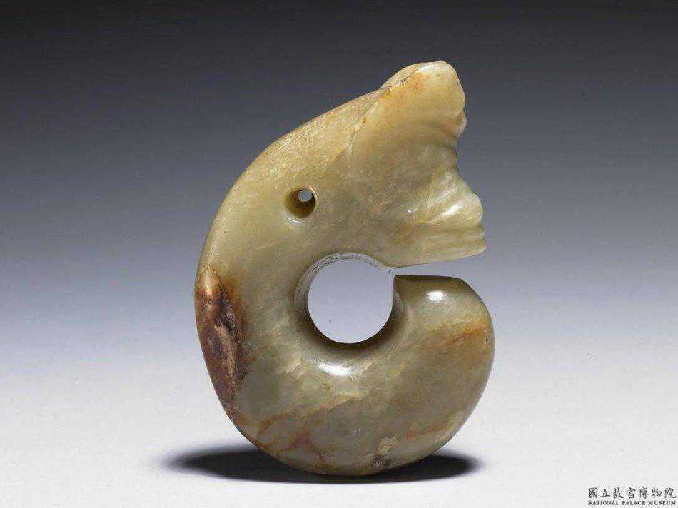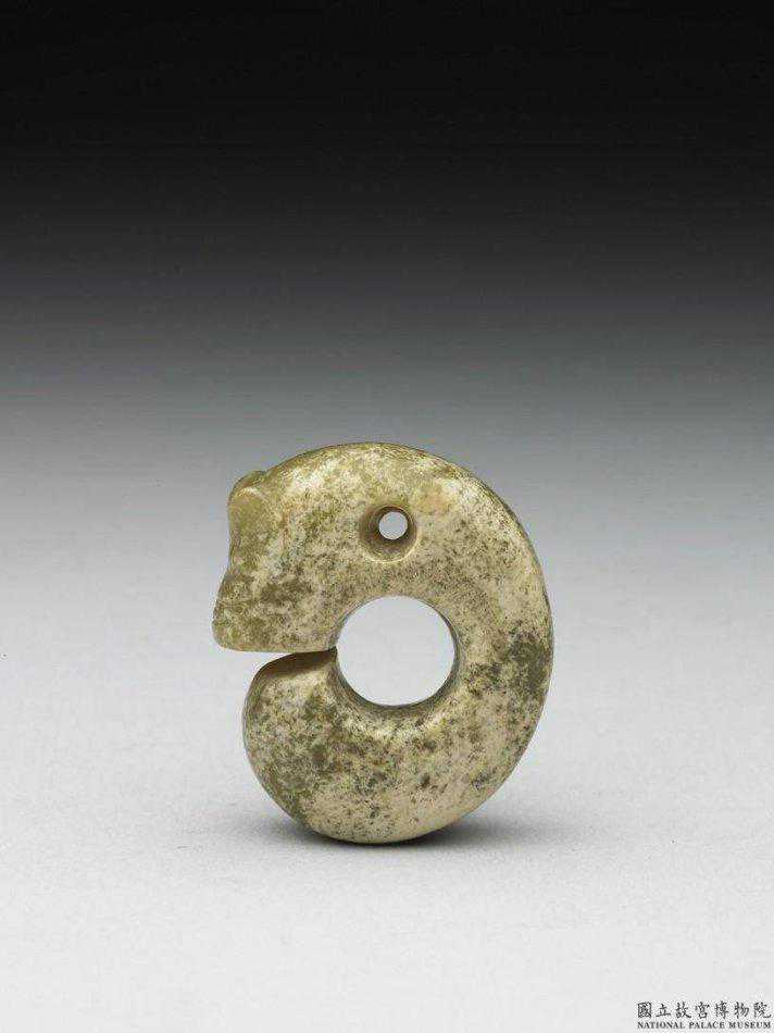 紅山文化晚期玉豬龍青黃綠玉,頗多白沁。器呈C形。一端琢一獸首,大耳、皺鼻,身軀彎繞成C形。上端鑽有圓穿,供穿綬懸佩。此類動物形玉佩,目前多稱為豬龍。高4公分。國立故宮博物院。