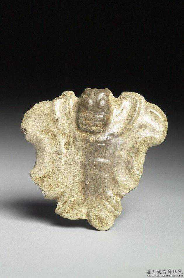 興隆窪文化晚期至紅山文化早期白石女神玉石質,琢一小人,立像。誇張圓碩的腹、腿,五官刻畫簡率。背上有圓穿,供穿繩懸飾。高4.4公分。國立故宮博物院。