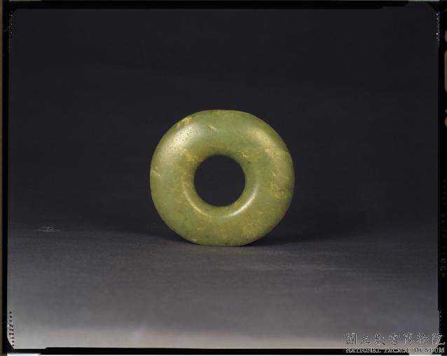 新石器時代晚期素環。綠色玉質,雜布灰褐色斑紋和白綹,半透明。略成橢圓形;中孔正圓,厚重,肉中厚而內、外均磨成圓弧而略薄。兩件形制、大小幾近雷同,器厚重古拙。表面光素溫潤。類似此器之綠色系玉材,是北方新石器時代晚期的先民習用者,尤以紅山文化為主的玉器。直徑8.91×8.45公分孔徑3.37公分厚1.57-0.14公分。國立故宮博物院。
