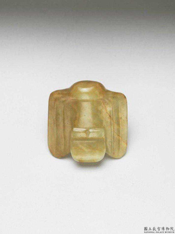 紅山文化晚期鳥形玉佩。琢成一雙翼平展的鳥。正面,喙及足的部位突出,大而圓的眼睛隱隱鼓起於頭頂,翅膀上浮現數道弦紋;背面光素,頭頸部有一隧孔。長4.7公分寬4.7公分厚1.5公分。國立故宮博物院。
