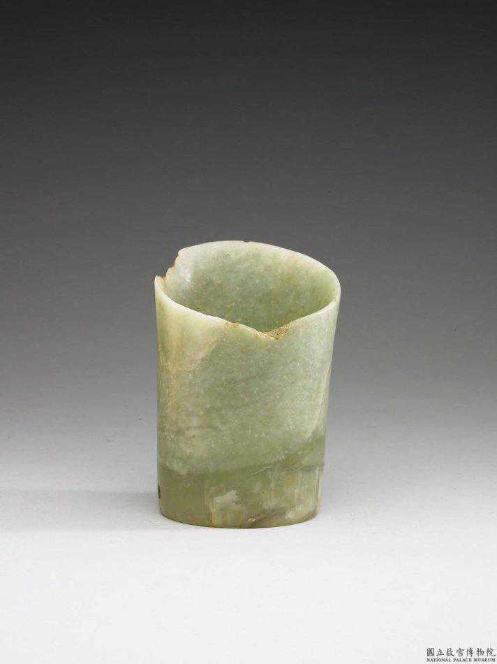 新石器時代晚期紅山文化晚期箍形器。淡黃綠色,有白綹,局部透明度甚大,似為岫岩玉。體作橢圓形筒狀。兩端口徑不等,一端平齊,一端斜口,形若馬碲。斜口一端由雨面磨薄似刃,但已局部殘缺。平齊的一端兩側各有一小圓孔,孔由單面鑽成。殘高12.3公分最寬7.9公分壁厚0.7公分。國立故宮博物院。