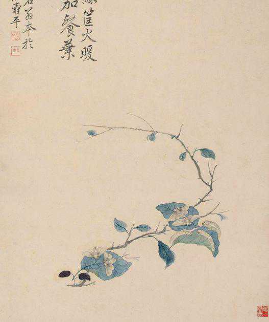 桑叶与蚕茧,是恽氏更早期的作品,所以还有勾勒的笔迹(《春蚕图》局部)。