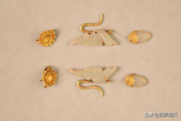 哈尔滨新香坊金墓出土的葵花形丁香(左),镶玉绶带鸟金耳坠(右)
