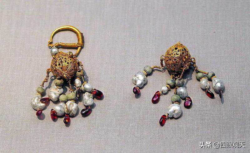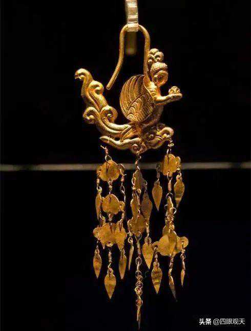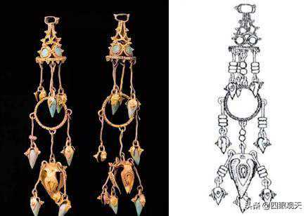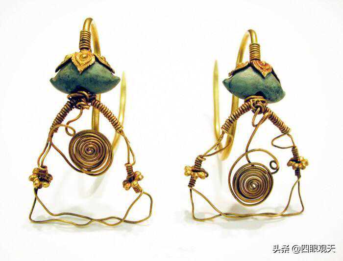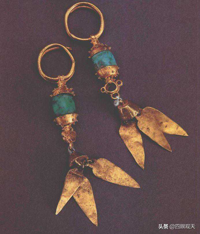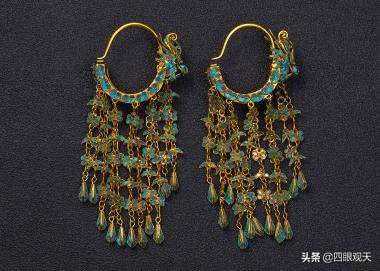 这些耳饰多是以黄金打造,并且镶嵌有绿松石、玛瑙等宝石,连缀以摇叶,非常华丽、精美。