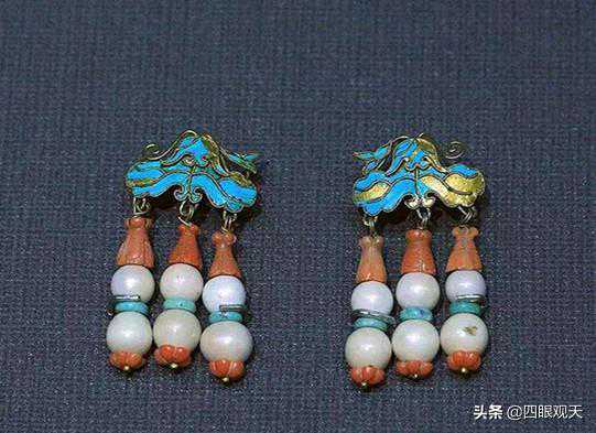 除了看重东珠,满族人还特别喜欢点翠首饰,翠羽与黄金相互对比产的视觉冲击很强,深受满人的喜爱,这种工艺自然也被运用到了耳饰中。小小的耳饰如何使用点翠呢?这还是从一耳三钳而来。在清中后期,满人逐渐改变了自己的一些习俗,其中就包括一耳三钳,但是皇帝曾经一再重申过要保持传统,那怎么办呢?就产生了一种耳坠,上面是一个脚,下面连接一个腰结,腰结下缀三列耳坠。腰结是有一定面积的,可以在上面点翠。在此基础上,又衍生出一种流苏形的耳坠,加上点翠、镶宝,看起来很有气派,成为重大场合女性打扮自己的重要配饰。