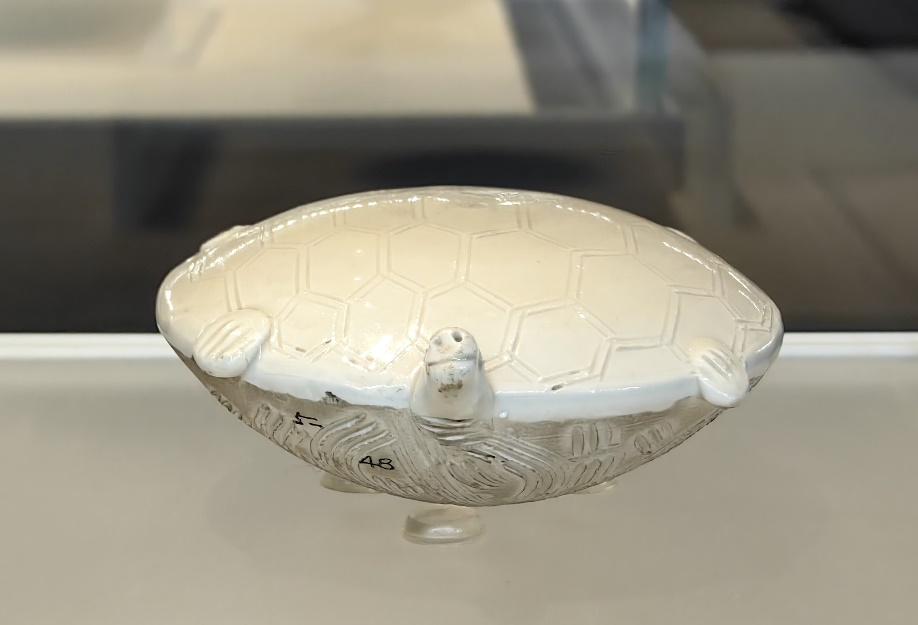 白釉瓷龟,静志寺塔基出土。高3.8厘米,通长8.8厘米,龟首上扬,鼓腹中空,短尾曲卷,四肢为片状趾蹼,龟背双勾六角纹龟甲。佛教将龟比喻为佛理中的“生”与“涅槃”。这件瓷龟整体可浮于水上,形象生动,为北宋初年定窑工艺瓷的佳作。