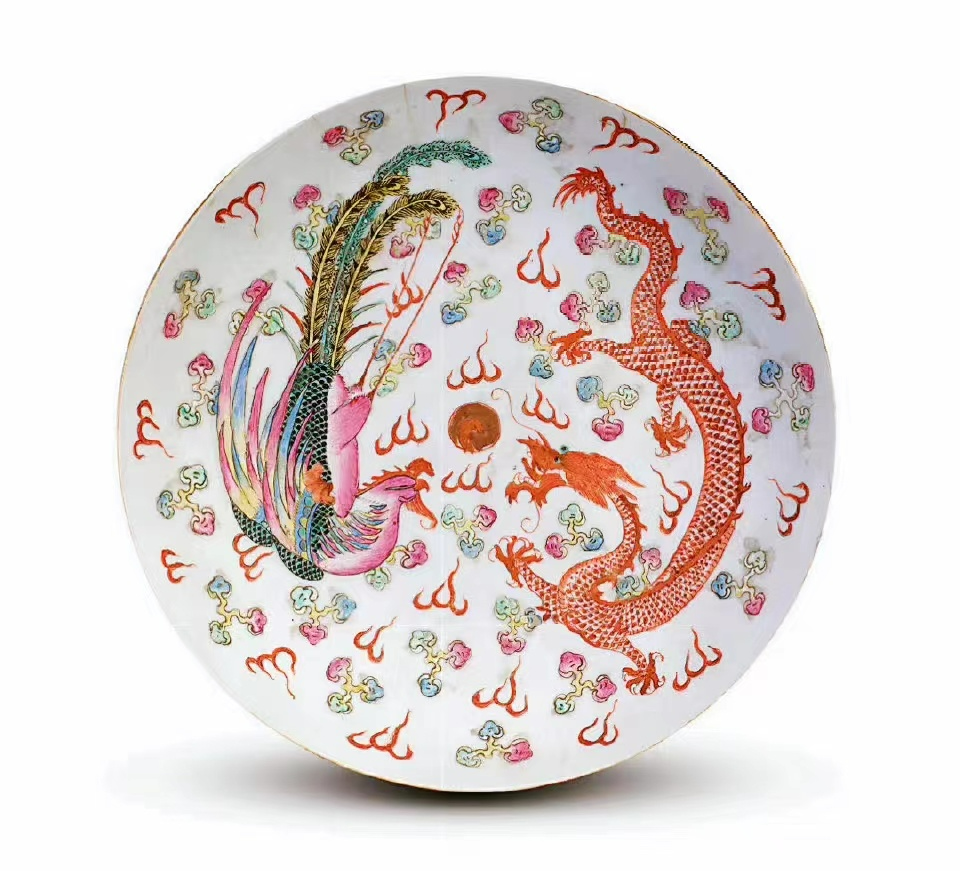 图丨清光绪款粉彩龙凤呈祥花卉纹盘