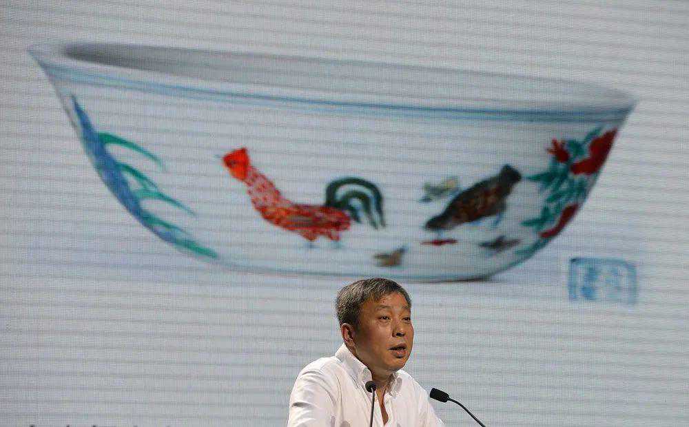 2014年4月27日,刘益谦在成都讲述他花2.8亿港币拍下的斗彩鸡缸杯。(王勤摄)