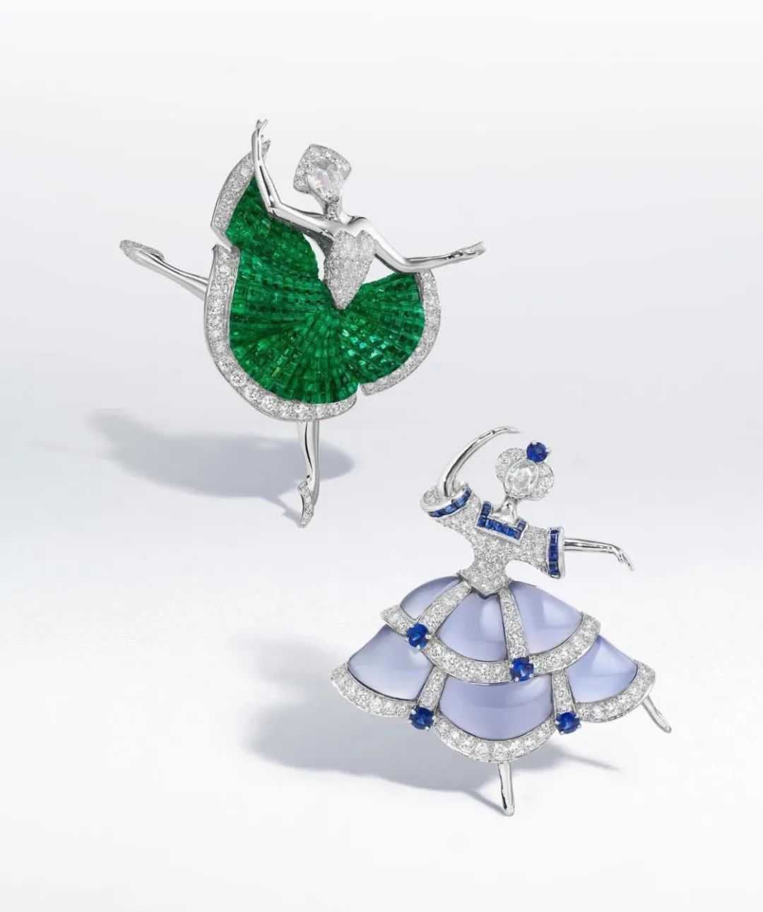 9、梵克雅宝(VanCleefArpels)祖母绿和钻石制作的“芭蕾舞演员”胸针和梵克雅宝(VanCleefArpels)蓝宝石和钻石“芭蕾舞演员”胸针预计拍卖价分别为HKD950,000元-1,200,000元和HKD320,000元-500,000元。