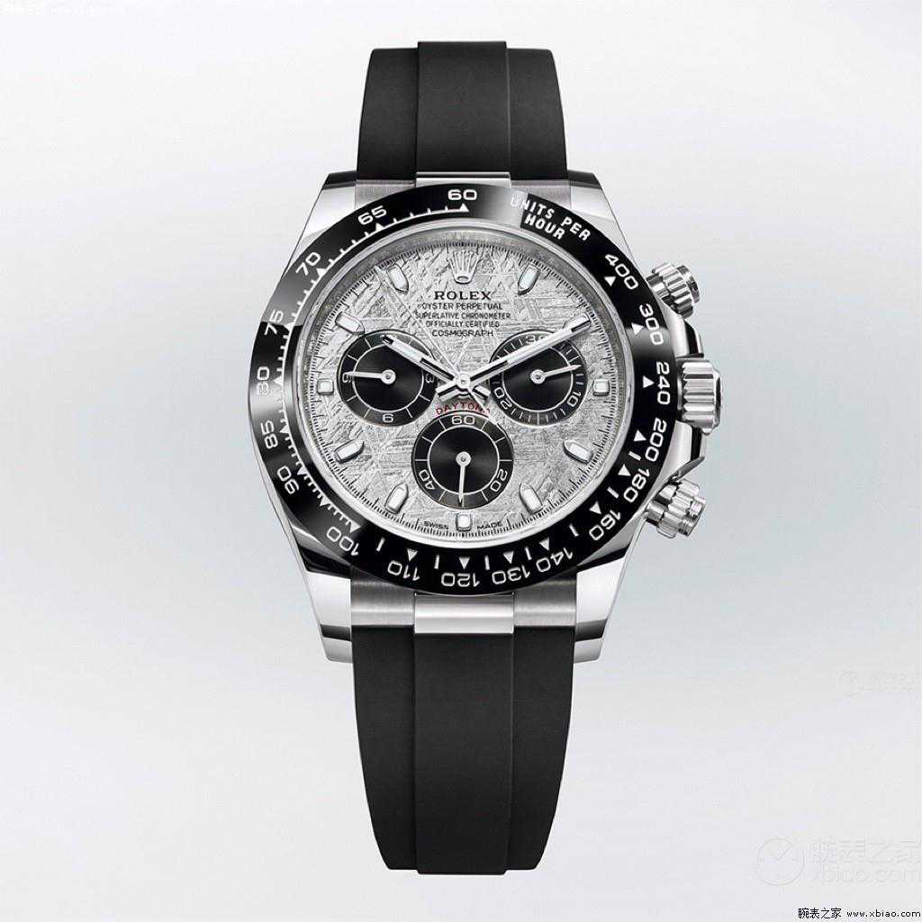 腕表点评:有道是“一劳永逸”,有了劳力士不愁没有女朋友。这款宇宙计型迪通拿是去年推出的新款,目前来看,也是一表难求,二级市场加价疯狂。这款表是用来定位于专业赛车的腕表。蚝式表壳用实心18ct白色黄金铸造。40毫米表径,表盘选用陨石制造(陨石表盘经过切片和化学处理,每一款陨石表盘都具有独一无二的维德曼交角花纹)在表盘的6点钟、3点钟和9点钟位置分别设有小秒针、30分钟和12小时计时盘,品牌配备的Oysterflex表带不仅坚固可靠,且橡胶材质非常适合夏天佩戴,灵活舒适。搭载4130型自动上链机械计时机芯,这款机芯拥有劳力士超卓天文台认证,在精准度、防水、动力储备与自动上链方面表现卓越,具备72小时动力储备和100米防水性能。