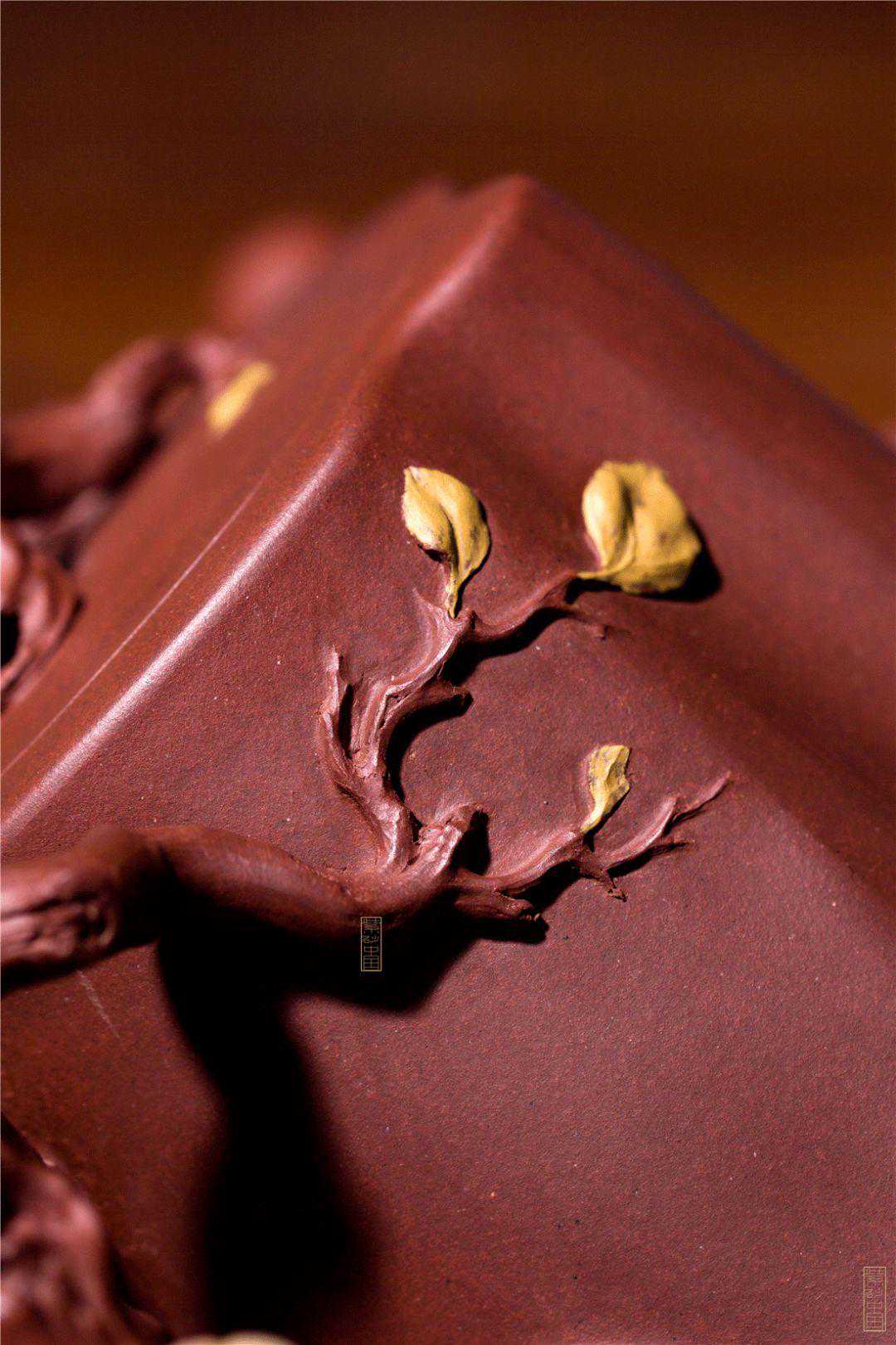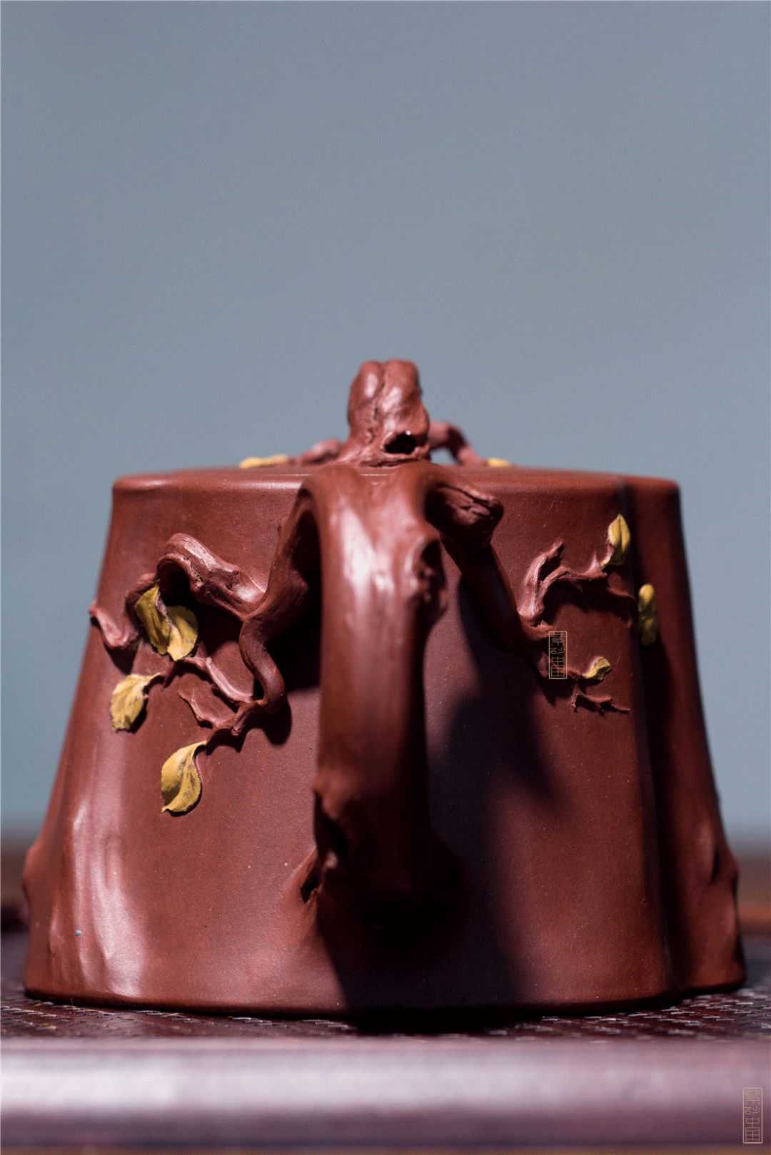 作品壶流、壶柄亦塑成老树之形,挺秀有神,比例协调,壶身树皮斑驳苍劲,树枝虬蟠其上,树叶写形亦写意,形意俱佳,使整器气势古朴,气韵十足。