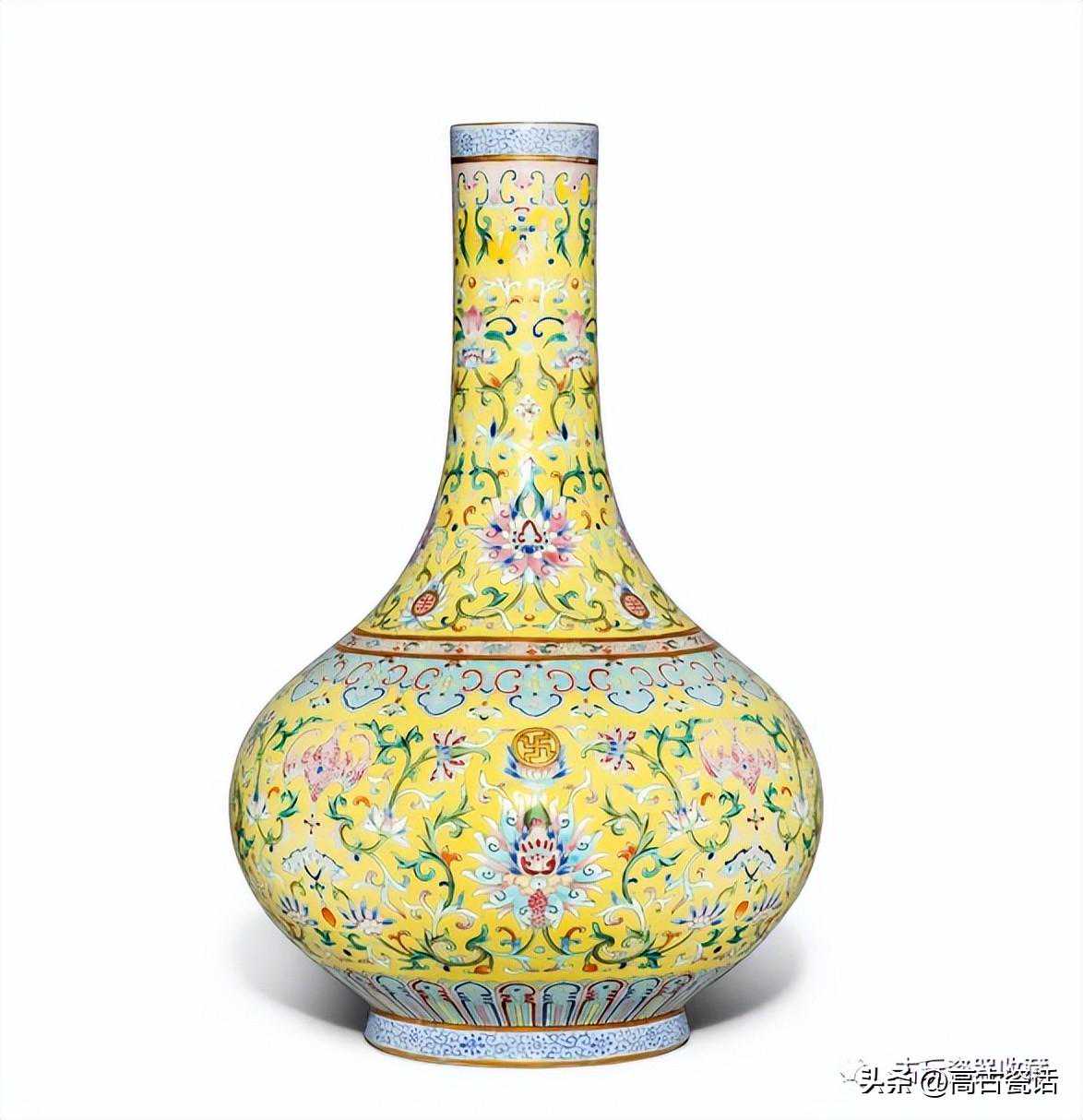 清嘉庆黄地粉彩福禄万代长颈瓶