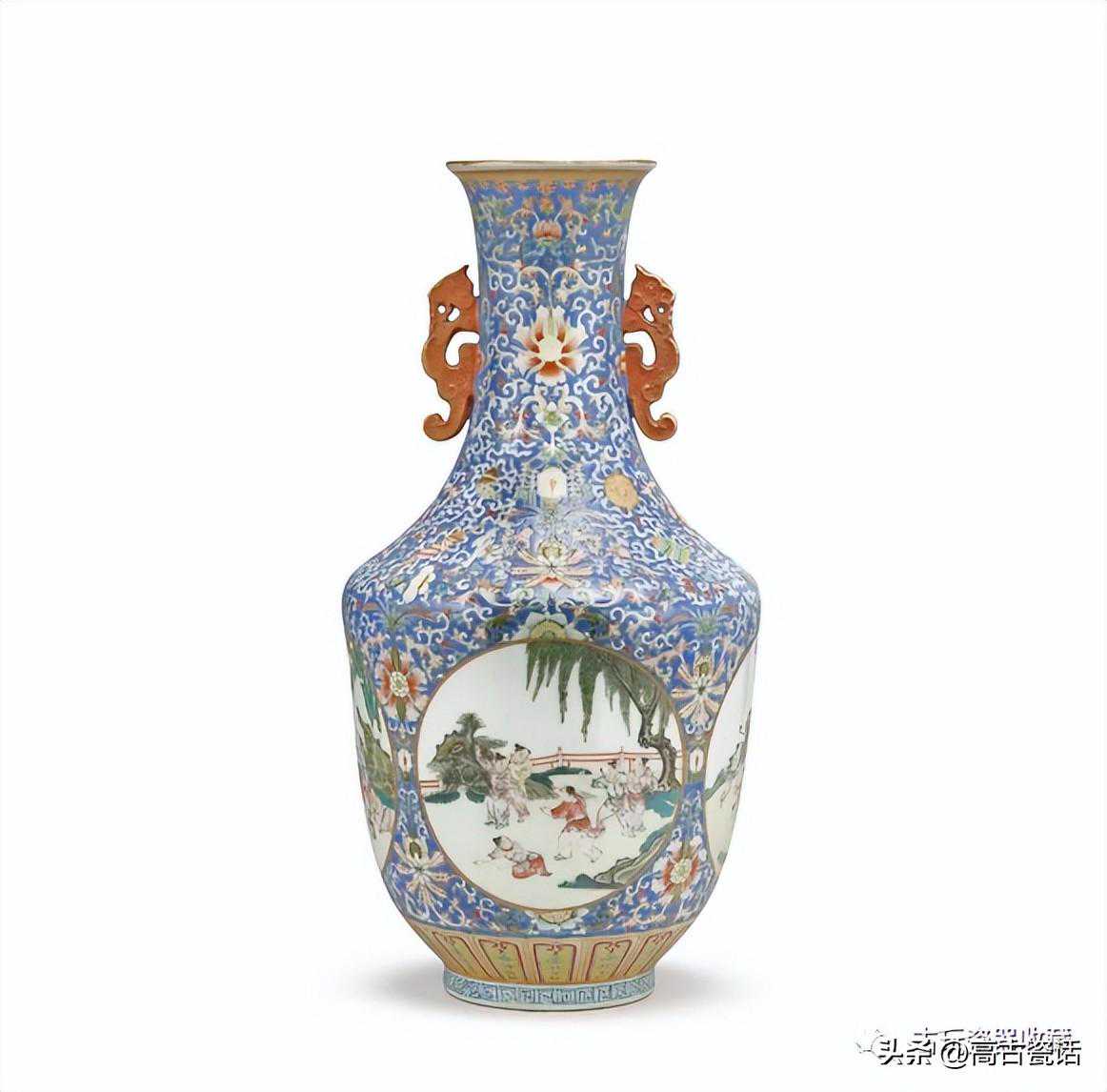 清道光蓝地粉彩开光婴戏图雙耳瓶