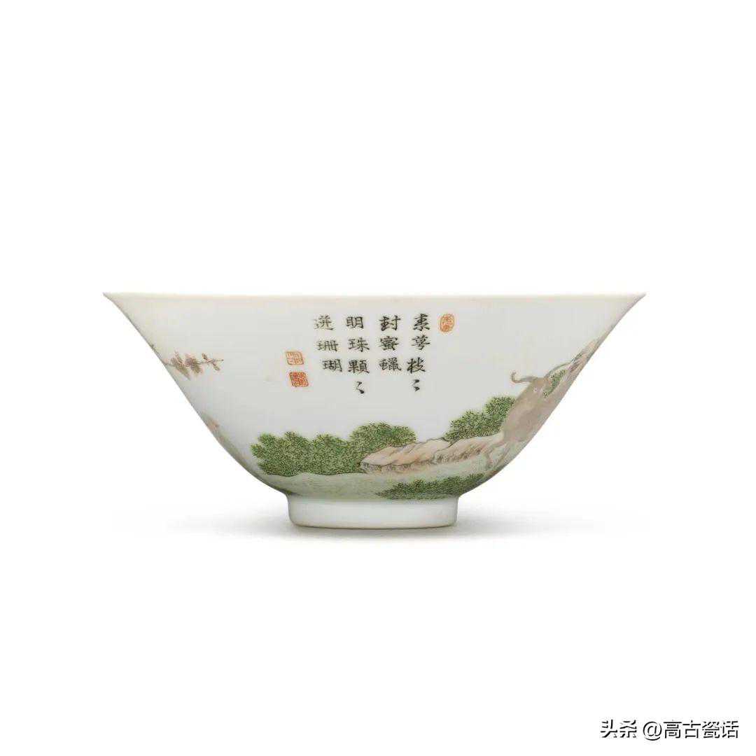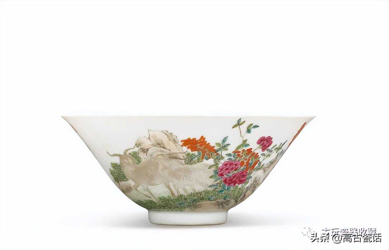 清道光粉彩三羊开泰诗文笠式盌
