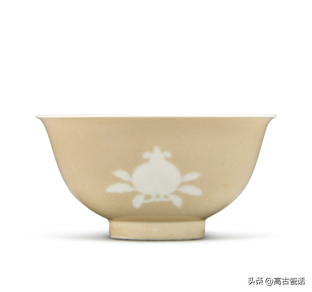 清雍正米黄地堆白三多纹碗