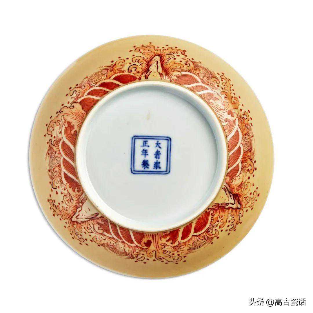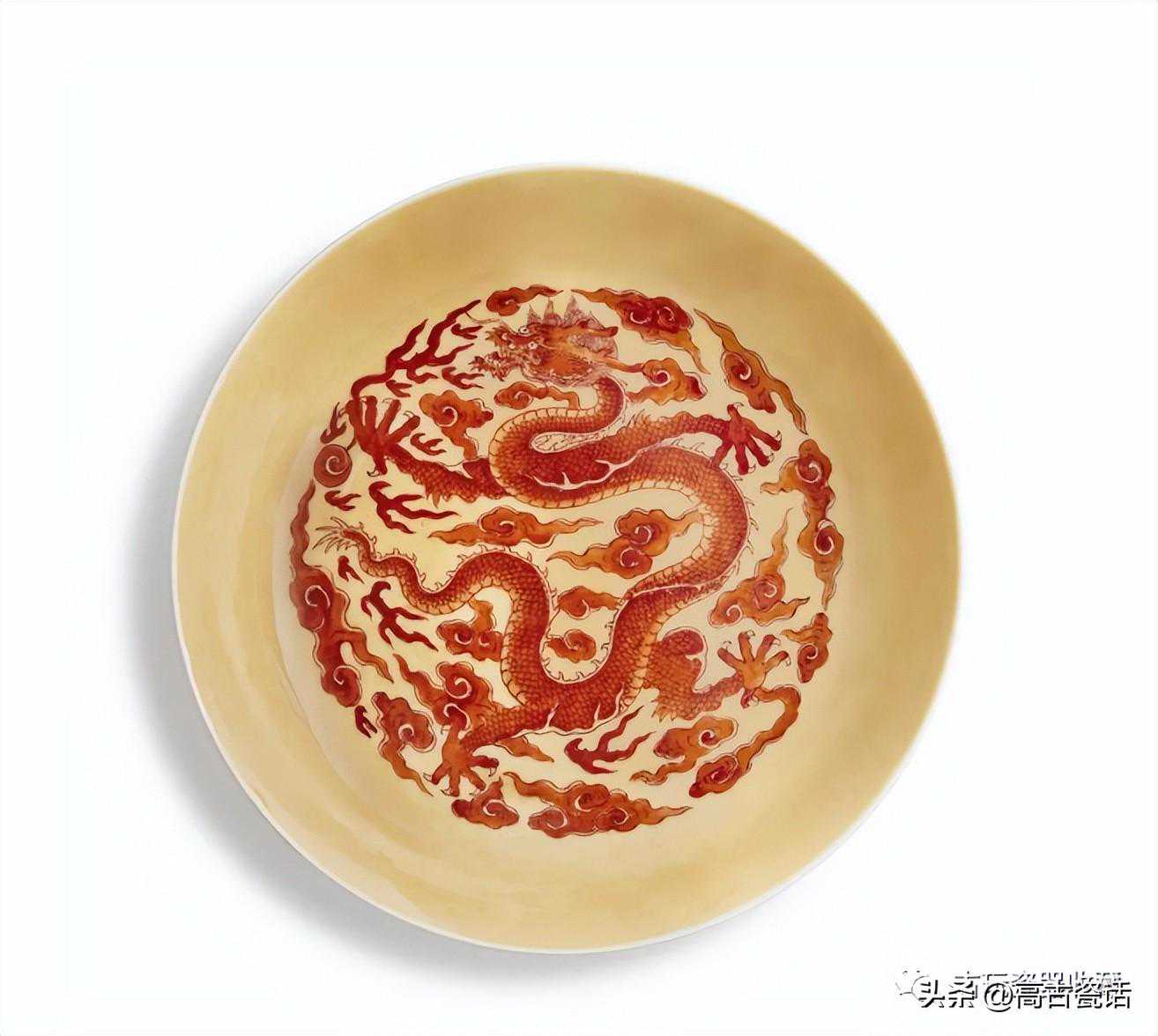 清雍正米黄地矾红彩云龙纹盘