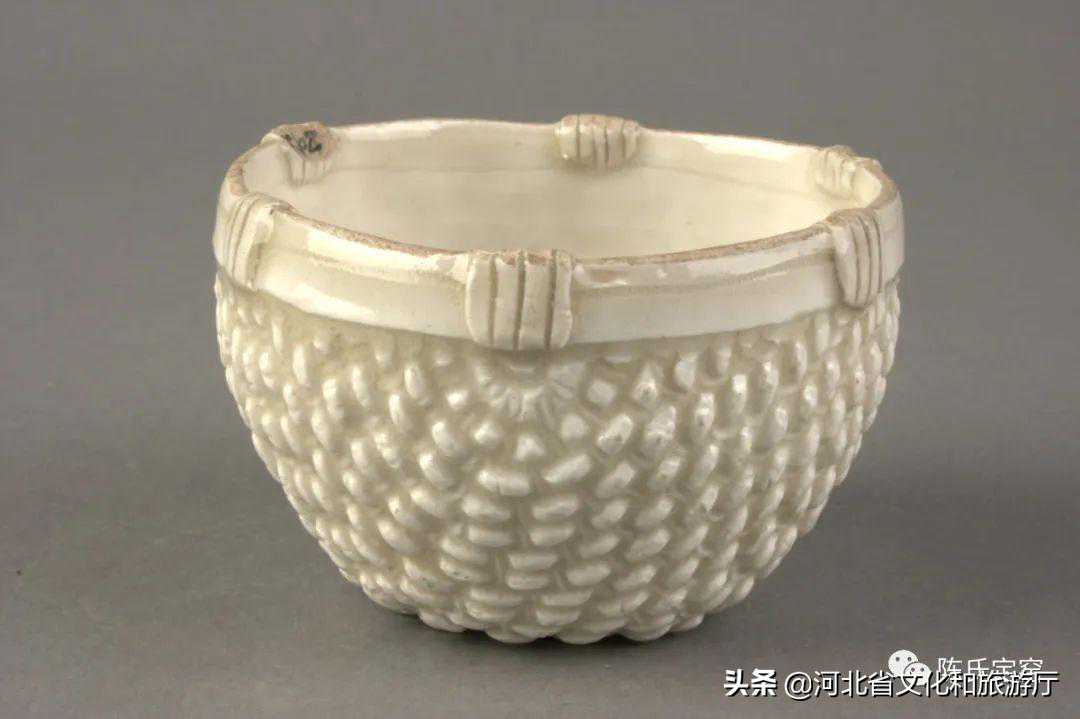 定窑柳斗杯,模印柳斗纹,编织纹路、扎结细节惟妙惟肖。明收藏家项元汴谓“其柳斗之式,纤藤穿挽,宛转屈折,俨若人工,以为饮器,甚为奇特”。