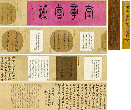 此卷为经宇道、胡师文、张景修、朱熹、查籥、戴在等九位名贤为徐铉篆书《项王亭赋》题赞之作,现存北京故宫博物院。《徐常侍篆书之迹》是南唐徐铉为“项王亭”碑而篆书唐代李德裕《项王亭赋》的真迹,亭碑今俱不存。