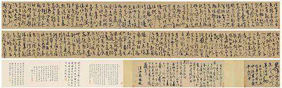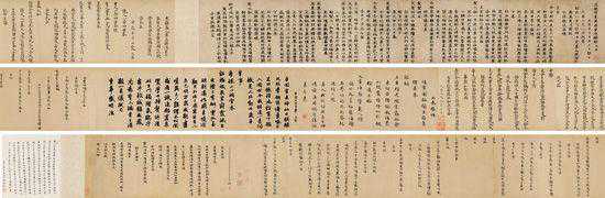 黄庭坚(1045-1105),字鲁直,号山谷道人,晚号涪翁,洪州分宁(今江西省九江市修水县)人,北宋著名文学家、书法家,生前与苏轼齐名,世称“苏黄”。此幅手卷内容是黄庭坚生前最为推崇的唐代宰相魏征所写的《砥柱铭》,全文600多字,用笔凝练有力,结构开合有度。卷上有宋代贾似道、明代项元汴直至清代民国藏家的大量题跋和钤印。