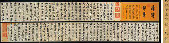 张照(1691-1745),字得天,号泾南,亦号天瓶居士,江南娄县人。清朝藏书家、书法家、戏曲家、书画目录整理者。此卷原藏于干清宫,共钤盖有乾隆鉴藏章三十三方。此卷未属年款,书于洒金蜡笺。引首为乾隆御笔,以“瑰辞神笔”誉韩文张书,并以“数典韩张碑并寿”为结句,认为张照书法可与韩愈文章一样流传千古。整幅作品秩序井然,墨色乌亮沉实,笔画劲挺,行笔奔放而不失法度,气势雍容。