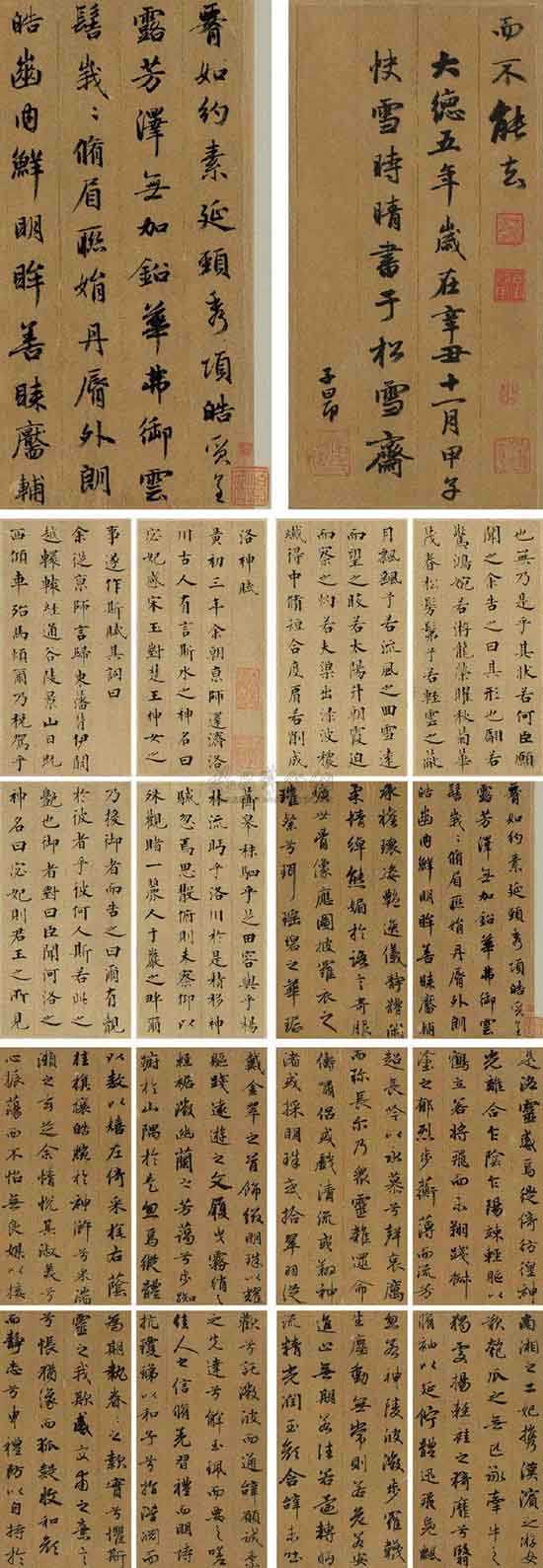 赵孟頫(1254-1322),字子昂,汉族,号松雪道人,又号水晶宫道人,中年曾署孟俯,浙江吴兴(今浙江湖州)人。著名书法家、画家、诗人,宋太祖赵匡胤十一世孙、秦王赵德芳嫡派子孙。此幅《洛神赋》书于赵孟俯四十八岁时,其时赵氏正在江浙等处儒学提举任上,故自署书于松雪斋。此幅作品结体宽博俊美,笔法圆转纯熟。此册前三开六页赵书已佚,由成亲王永瑆补足。