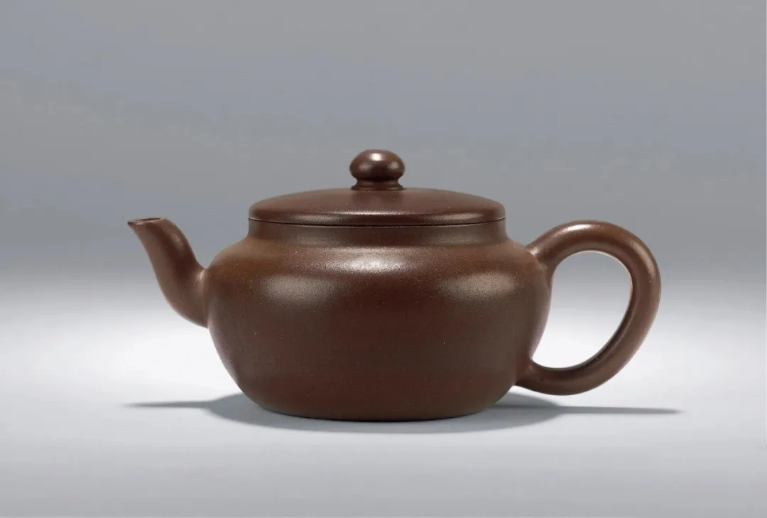 紫泥款同样惊艳,此壶颈与壶盖相切,扣合严密,浑然一体。圈把与身称势,气韵贯通。