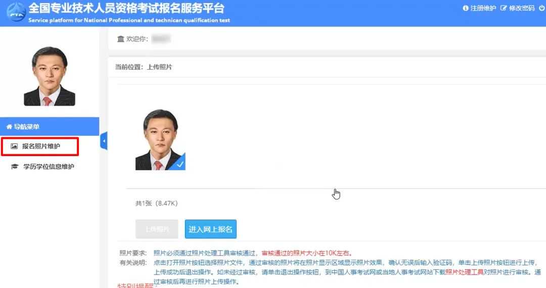 新考生注册完账号后,首次登录还需上传符合规定的照片才能开始报名。
