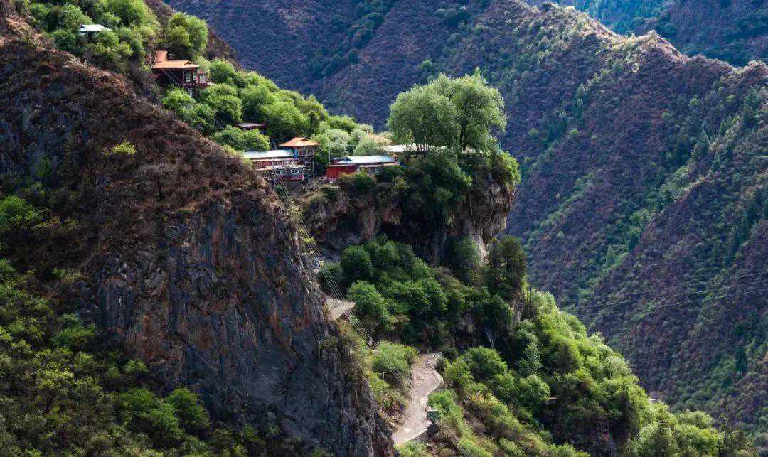 可以看到对面山腰红色崩空式的藏式木屋