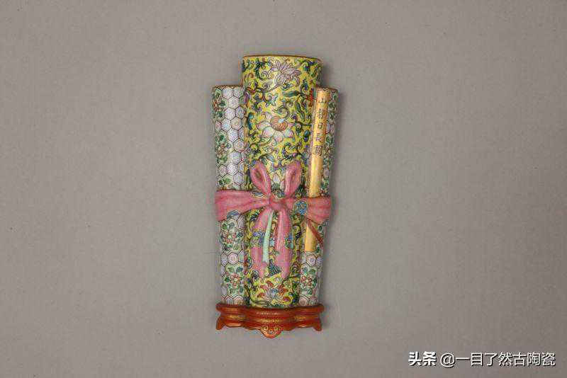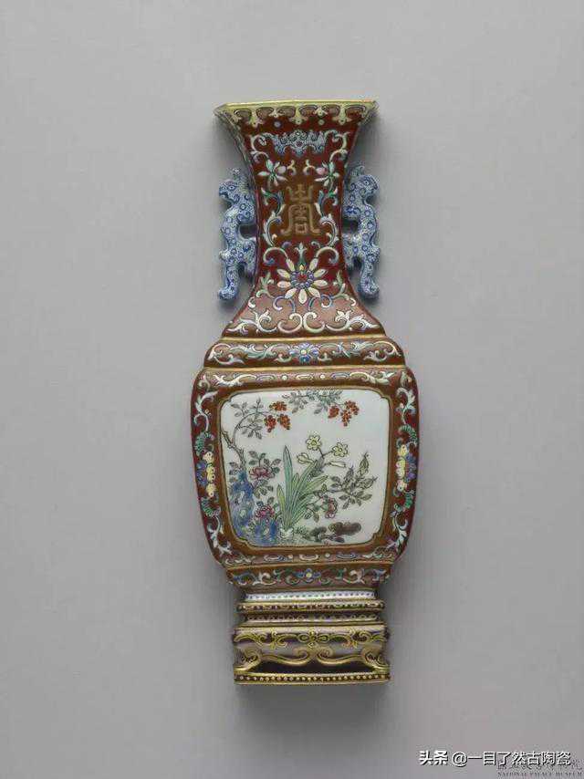 壁瓶又称轿瓶,是正常圆形或方形瓷器“半份”的造型,陈设的时候一般是挂着的,所以后壁为平板形,没有施釉等装饰,烧制时后背一般还预留有挂孔,以便将其固定在墙壁或床榻、轿子的内柱上。台北故宫的统称为“轿瓶”,但根据壁瓶的丰富用途,我还是觉得我们“壁瓶”的说法比较贴切。