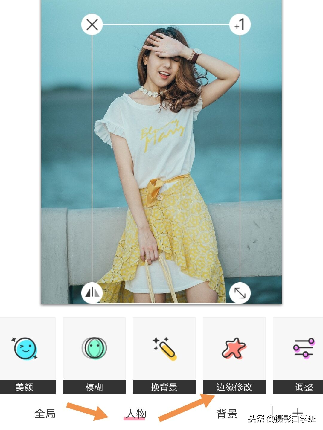 7、在人像的右下角,有一个双向的箭头,拽动箭头,可以改变人像的大小。单个手指,按住图片,可以移动图片位置。