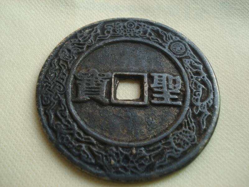 此枚钱币外圆内有方孔,正面铸钱文“太平天国”四字直读。轮廓完整,文字清晰,此枚藏品为太平天国圣宝花钱,钱面有“太平天国”四字直读,字体端庄严谨,笔划苍劲有力,边沿雕刻圣宝花钱"正面为双龙抢珠图案,正中穿方孔。