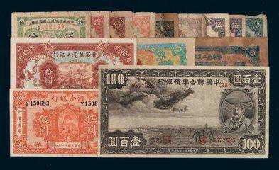 纸币名称年代价格备注1931年美国友邦人寿保险保单193120001931年中华苏维埃共和国国家银行湘鄂西特区分行贰角193125001931年苏维埃闽西工农银行股票壹圆193160001931年万载县工农兵银行银洋壹角193118001931年苏维埃湘鄂赣省总务处临时流通信用券折合银元壹圆19311600民国二十一年新疆财政厅库官票红线伍两1932100民国二十一年天华银号拾股伍佰圆股票一枚1932800民国二十三年辽宁鹿鸣春饮食店股票壹股现大洋壹佰圆一枚193220001932年鄂东苏维埃纸币一组七枚193230001932年皖西北特区苏维埃银行壹圆19325000民国二十一年中国通商银行上海拾圆1932800民国二十一年绥西垦业银号包头壹圆19321000民国二十一年川康国防费临时筹集处借券伍圆193210001932年中华苏维埃共和国湘鄂赣省苏财政部发行税券19321000民国二十二年福利银号汇兑券宣化伍角、无地名伍圆各一枚193312001934年商办闸北水电股份有限公司第壹期债券壹仟元一枚193422001934年雄県民营公路有限公司股票壹股一枚193410001935年苏维埃西北分行伍分1935600民国二十五年中央银行伍佰圆1936600民国二十六年儿童银行儿童食品赠彩券伍圆1937200民国二十六年河南农工银行伍角1937100民国二十六年中国银行伍圆1937500民国二十七年中国联合准备银行百元19381000中国联合准备银行壹仟元1938600中国联合准备银行一组四十余枚19381500中国联合准备银行第五版一期壹圆券样本册一册19386500中国联合准备银行纸币样本册一组二册19384000民国二十八年中国银行廖仲恺像壹圆、伍圆、拾圆样票各一枚193920000民国二十八年松江县亭林镇商会临时代价券壹分1939300民国二十八年冀中区安平县农村合作社流通券伍角19396001939年《贵州经济》精装-巨册1939600