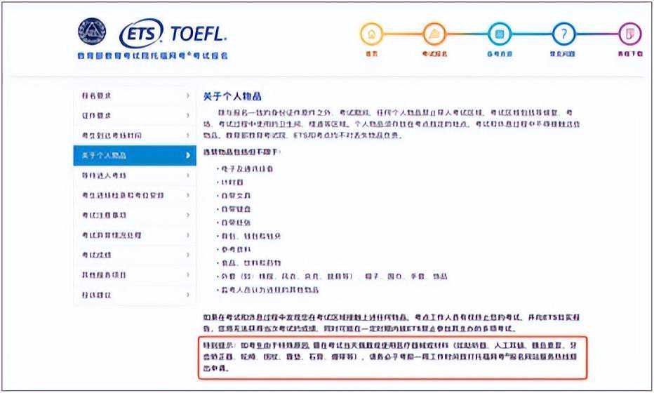 如考生由于特殊原因,需在考试当天佩戴或使用医疗器械或材料(如助听器、人工耳蜗、胰岛素泵、牙齿矫正器(牙套)、轮椅、拐杖、靠垫、石膏、绷带等),请务必于考前一周工作时间拨打托福网考报名网站服务热线提出申请。