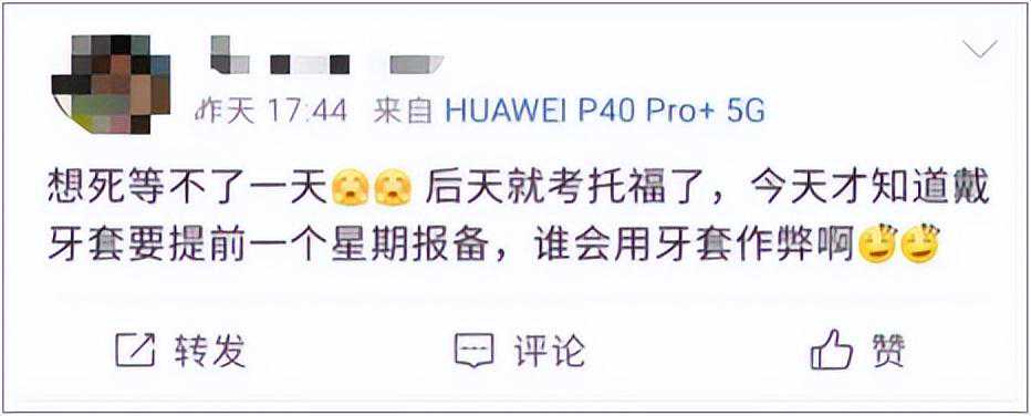 不过,这提醒了大家:如果非必要,大家不要赶在考试前一周戴牙套,也尽量减少打球等剧烈运动,小心受伤,耽误考试……