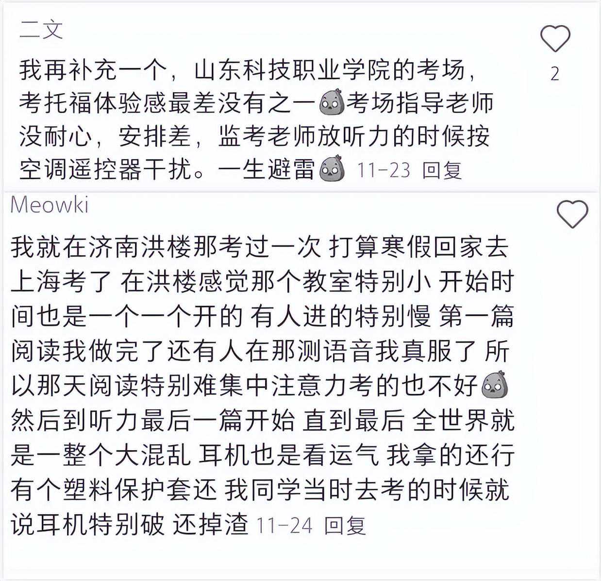 电脑、键盘比较难用,耳机也有漏音的情况,考场环境比较嘈杂,很容易受干扰。