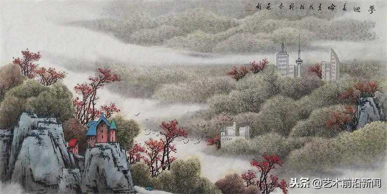 浅绛山水是画家的看家本领,在这里我们好像看到了画家创作旅程的规迹。大江南北的风土人情,三山五岳的绮丽壮美,跃然纸上。作品用笔含蓄稳健,墨色明澈秀润,计白当黑,层次清晰,将在阳光照射或云雾笼罩中的群山的远近隐现之态,表现得惟妙惟肖。章法严谨,技巧精妙,布陈立意,妙合自然。雪景山水为其得意之笔,它塑造了一个静穆、清凉的世界。皑皑白雪笼罩下的群峰溪涧,或高耸入云的积雪奇峰,时见山颠密林寒树丛生,或深山藏古寺,或临渡结茅居,小桥栈道,骑驴觅句,朝钟暮鼓伴随琴韵书声,行旅悬泉充溢着无限生机,天空、水面用淡墨烘托,山脚石坡皴擦减弱而气象雄浑。最见功力的当属界画,它是从楼台亭阁等建筑物为题材的绘画,如字中之楷书,禅门之戒律,画家之玉律;稍有疏忽便前功尽弃。画家深谙宋人界面之真谛,一点一画均无败笔,远山近水,殿堂回廊,人物舟楫,花木竹石,无不苦心经营,细心落笔,笔法秀劲,赋彩古雅,韵味清远,突破唐人浓郁之气。近几年画家创作了大量金碧山水,展出的作品也多为金碧大青绿。这种青绿为质,金碧为纹的山水画,极富装饰效果;它始于隋而成于唐、宋元以降,代有传人,不绝如缕。因其制作繁复,笔法精细,近代画坛专攻者绝少。画家不畏艰辛,十日一石,五日一水,三矾九染,描金嵌点。画面景物丰富,安排严整有序。青山滴翠,碧波粼粼,寺观村社,刻画精微。点景人物,栩栩如生。丘壑峻峭,构图雄奇,彩色富丽,意趣隽永。