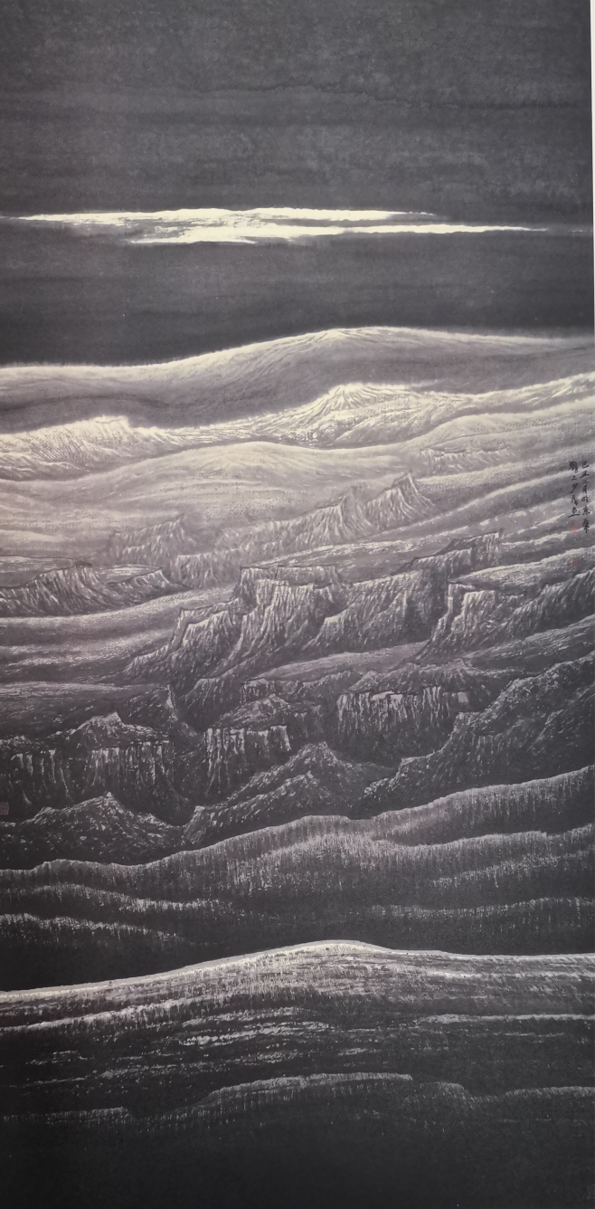 在本土山水画家中,郭文涛和陈天铀的形式风格,或豪迈或沉雄,复活了回荡在西部自然中的金戈铁马之声,这种类似边塞诗风的精神气概,既与西部自然的结构形态和宏大气势相颉颃,也应和了改革开放、高歌猛进的时代氛围,具有强悍的视觉冲击力,为世人所认可和熟知。创作之初,包少茂受其影响和吸引是必然的,所以才有机缘拜陈天铀为师。