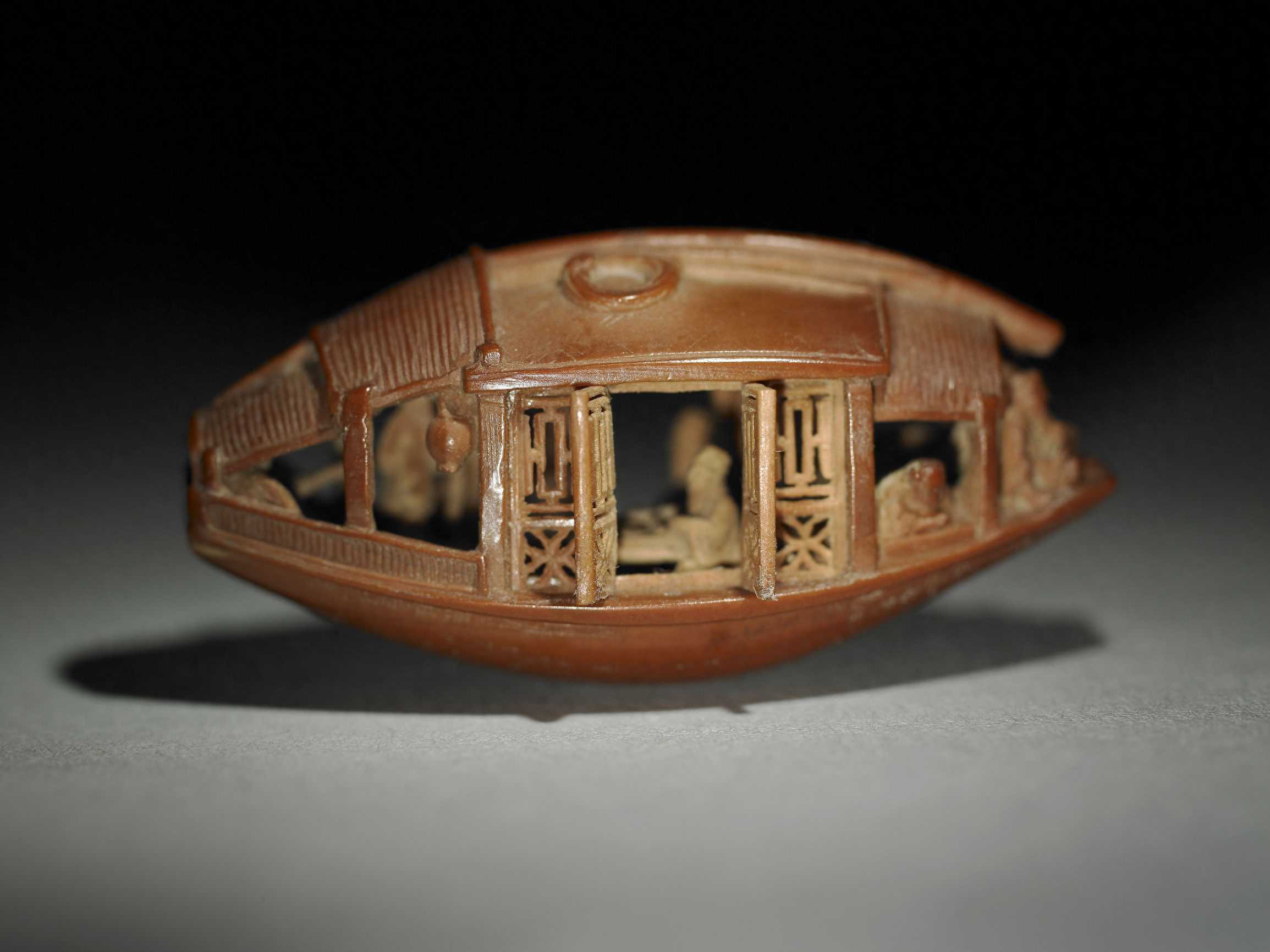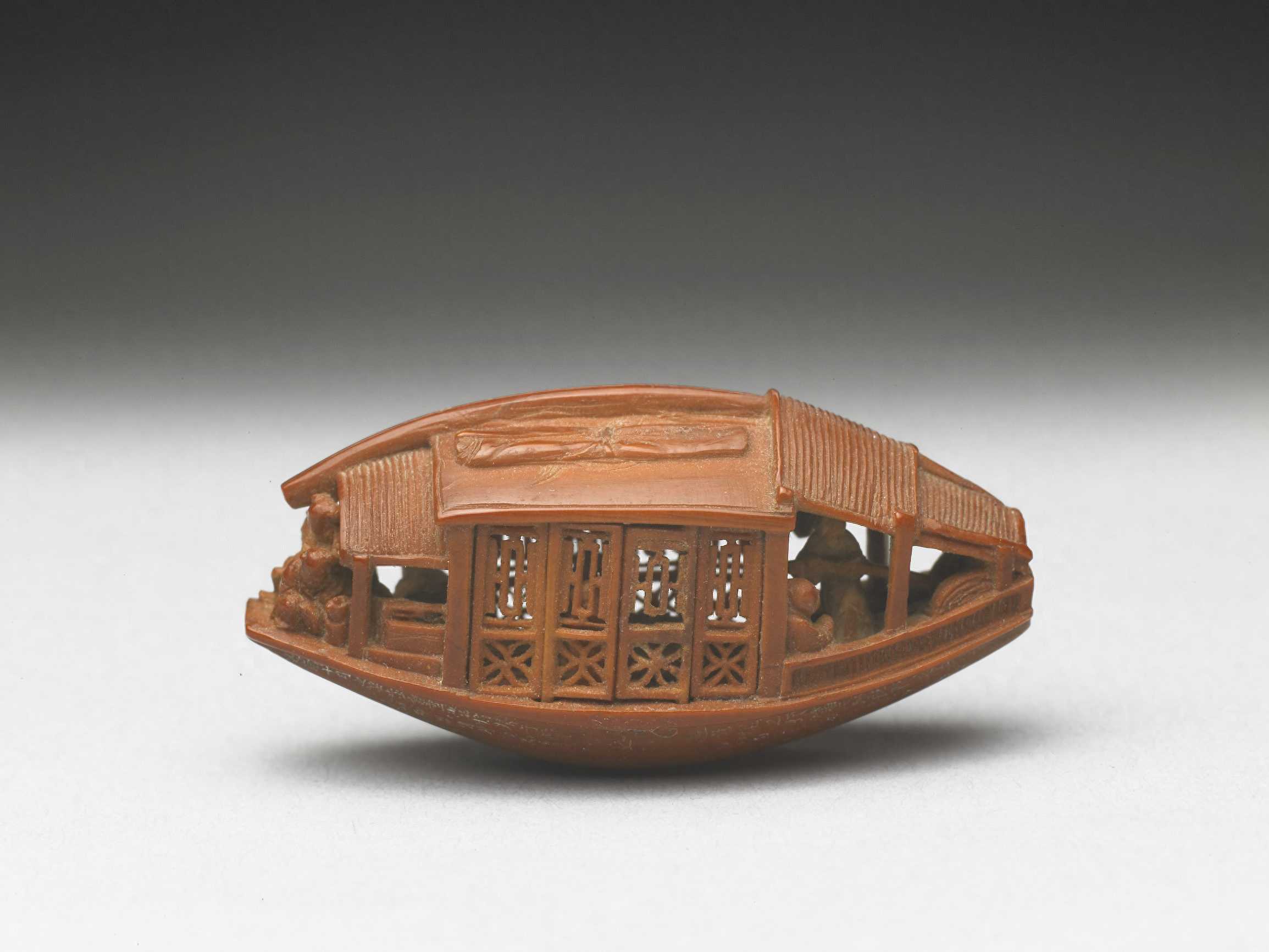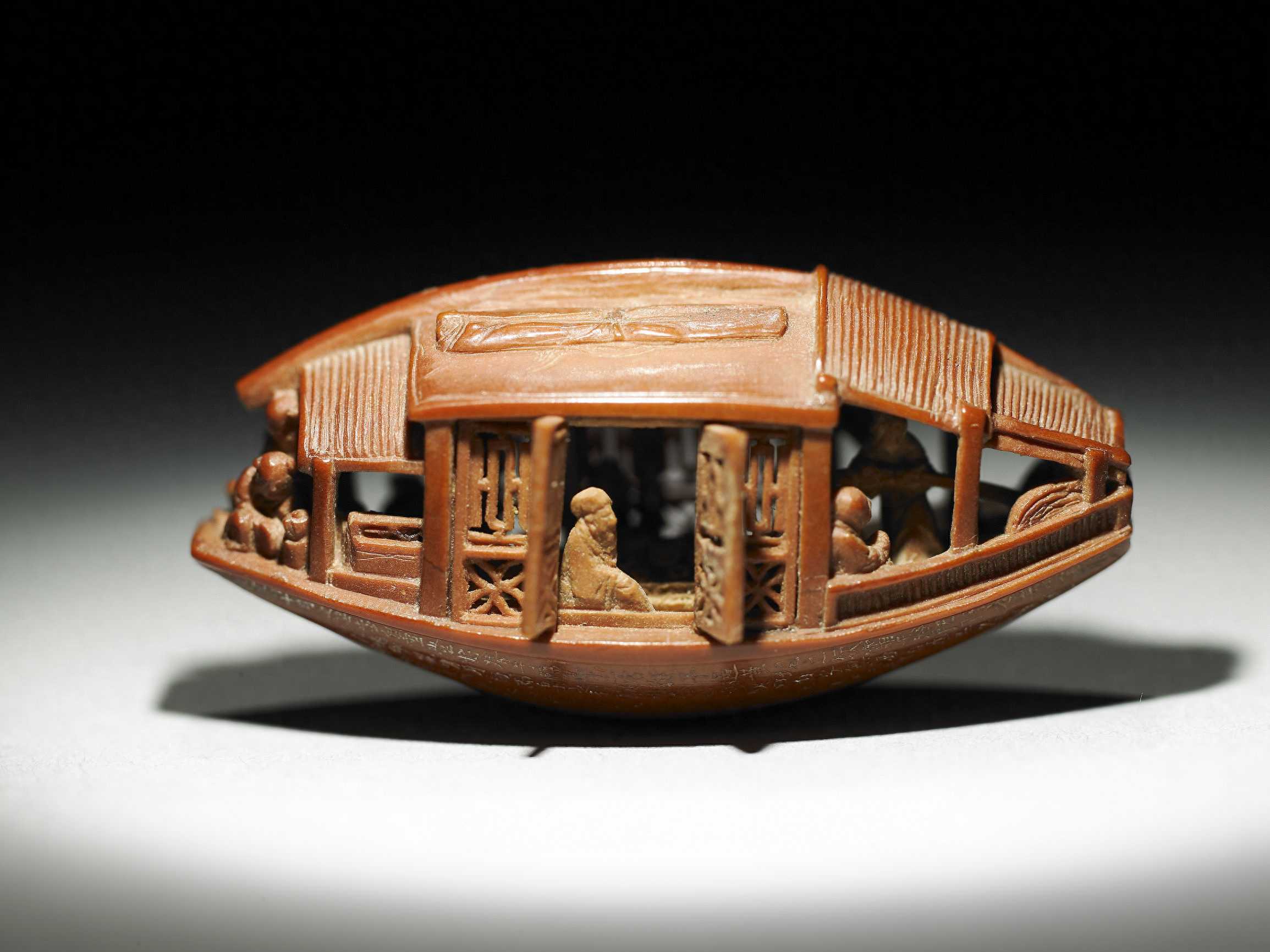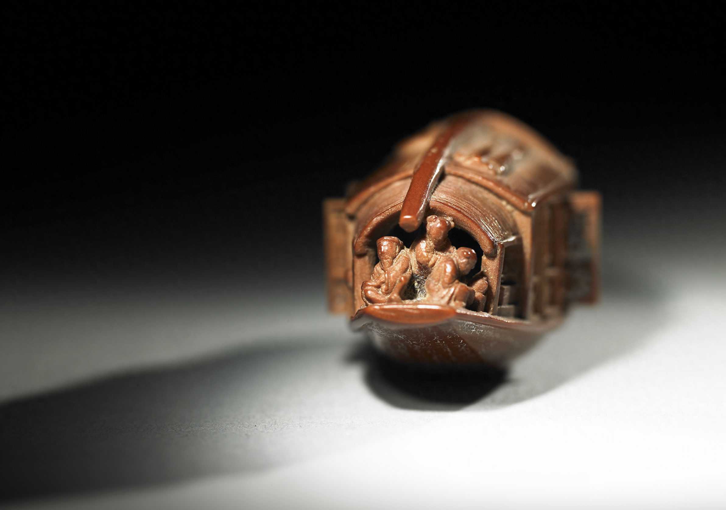 将千古传诵的文学名著,藉由微小核舟中的人物情态、空间配置与细节刻划点出月夜泛舟的意象