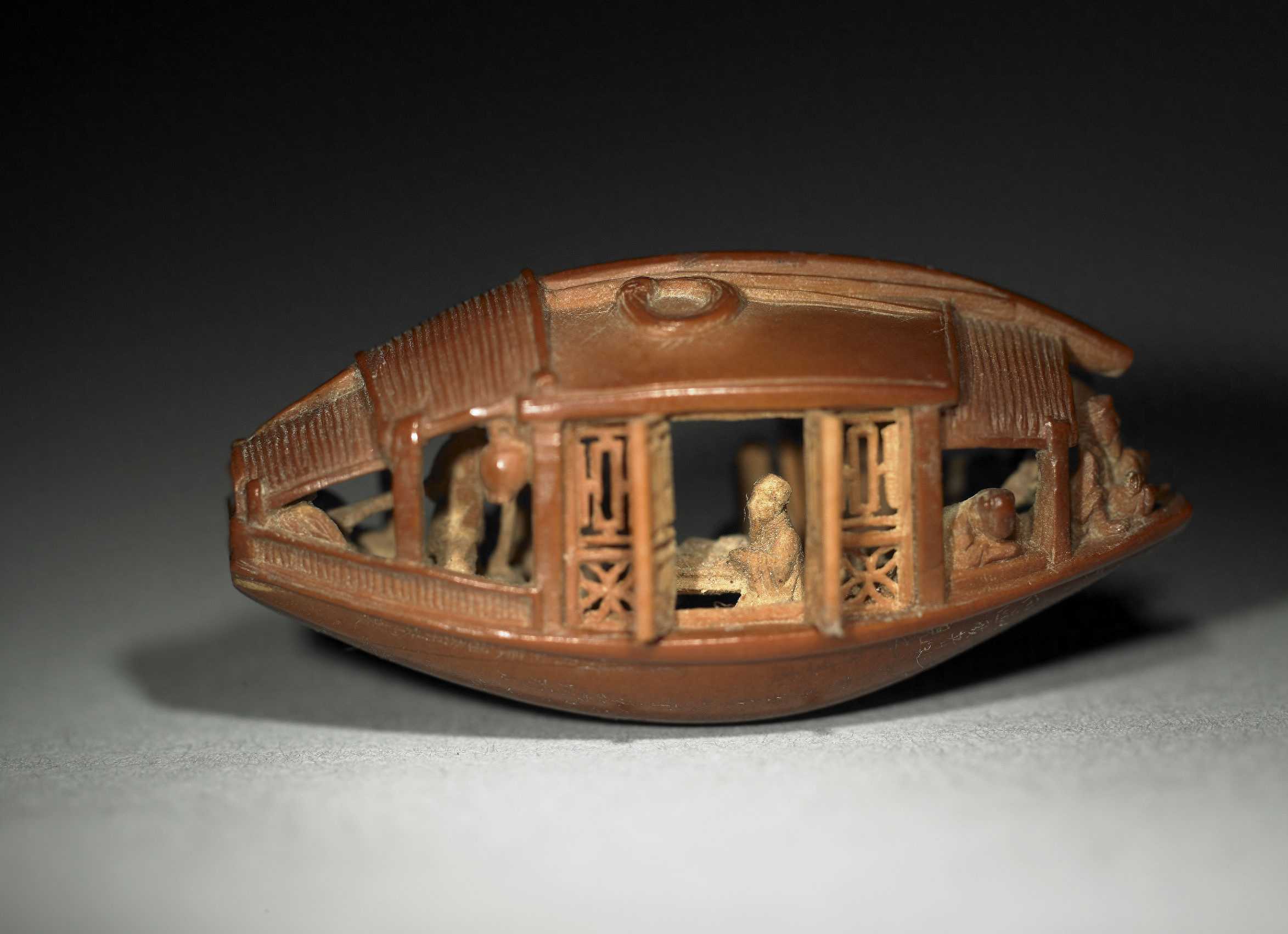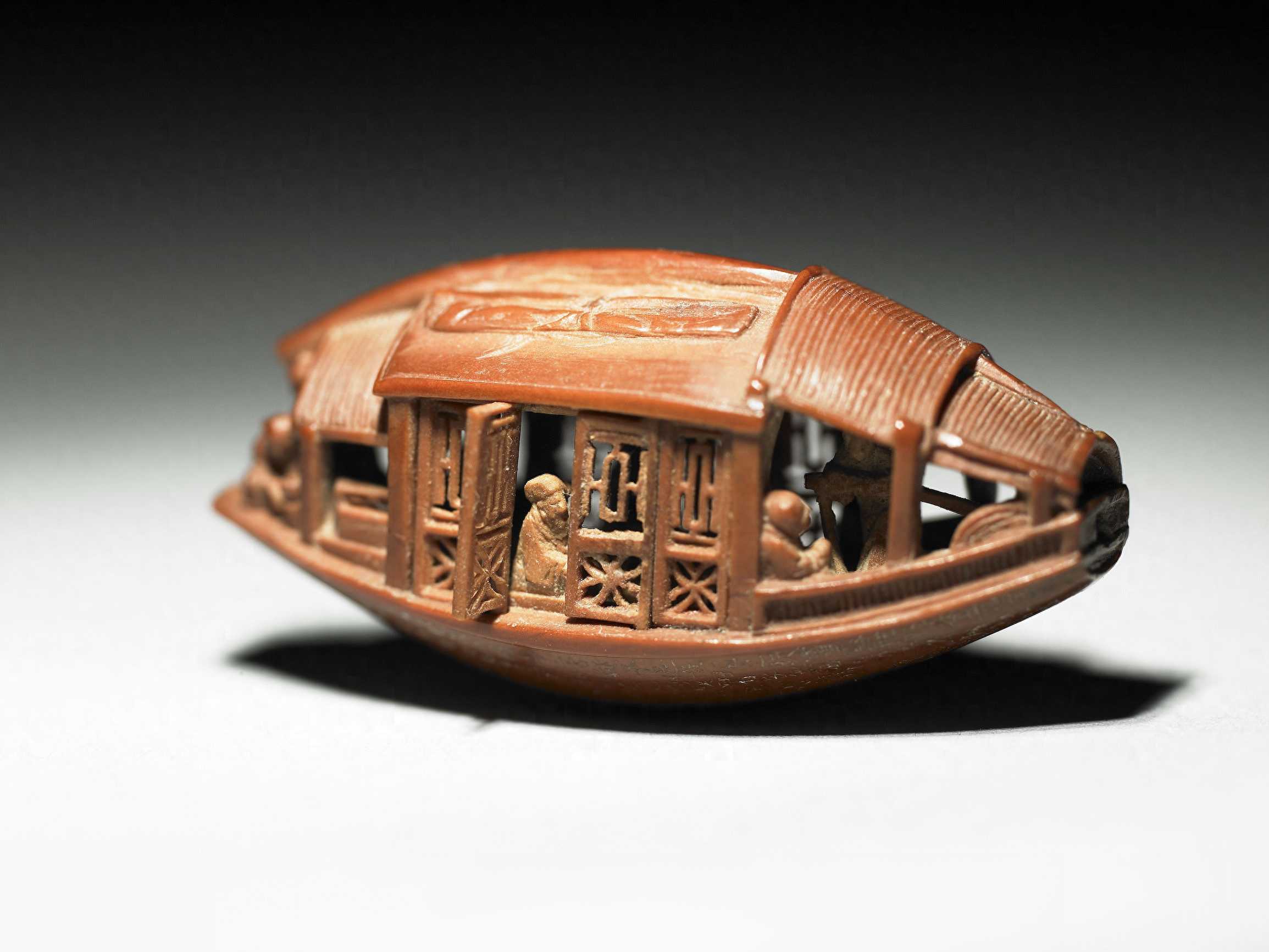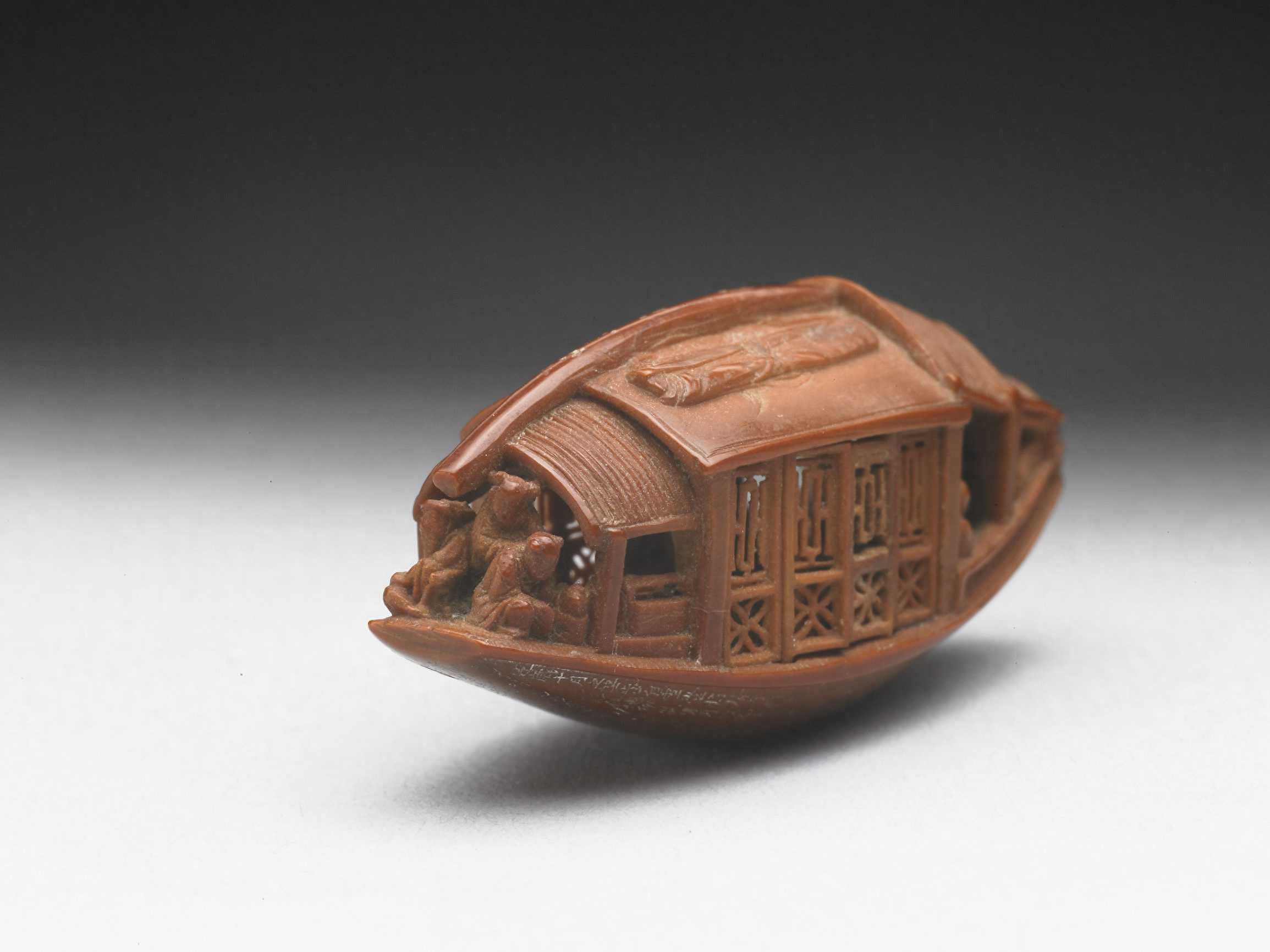 将千古传诵的文学名著,藉由微小核舟中的人物情态、空间配置与细节刻划点出月夜泛舟的意象