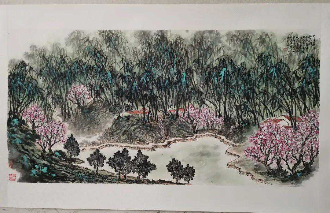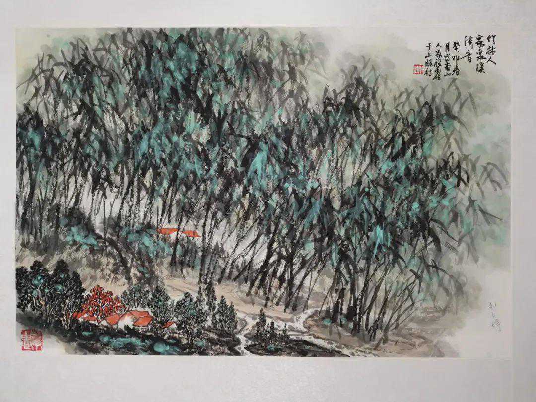 殷南柱是从溧阳走出去的一位纯粹的画家,他青少年时代是在溧阳度过的,对家乡有着特别而深厚的感情,这种感情是流淌在血脉中的。溧阳地处苏浙皖三省交界的江南鱼米之乡,溧阳不但山清水秀民风淳厚,而且历史悠久人文荟萃。其境内天目湖碧波荡漾鸟欢鱼跃,南山竹海峰壑相连涛声天际。大小水库星罗棋布,涧河溪泉纵横如织,错落有致的山村民舍时隐时现在山水之中,南峰北山遥向呼应,山水之间烟雾飘绕,似梦似幻,云锁峰顶又温情矜持,浓浓青翠的绿波,如江南女子般鲜艳欲滴,让人魂牵梦萦。他常说:家乡溧阳犹如画卷,步步是景处处可画,所以殷南柱跑遍了溧阳的村村落落、溪涧湖畔、丘壑岕沟,积累了大量的写生稿。多年来,他以溧阳为题材创作了200余幅作品,完成了多个系列作品,如《乡愁溧阳系列作品》、《竹海涛声系列作品》、《上殷村系列作品》、《山村雪景系列作品》、《南山花香系列作品》等。