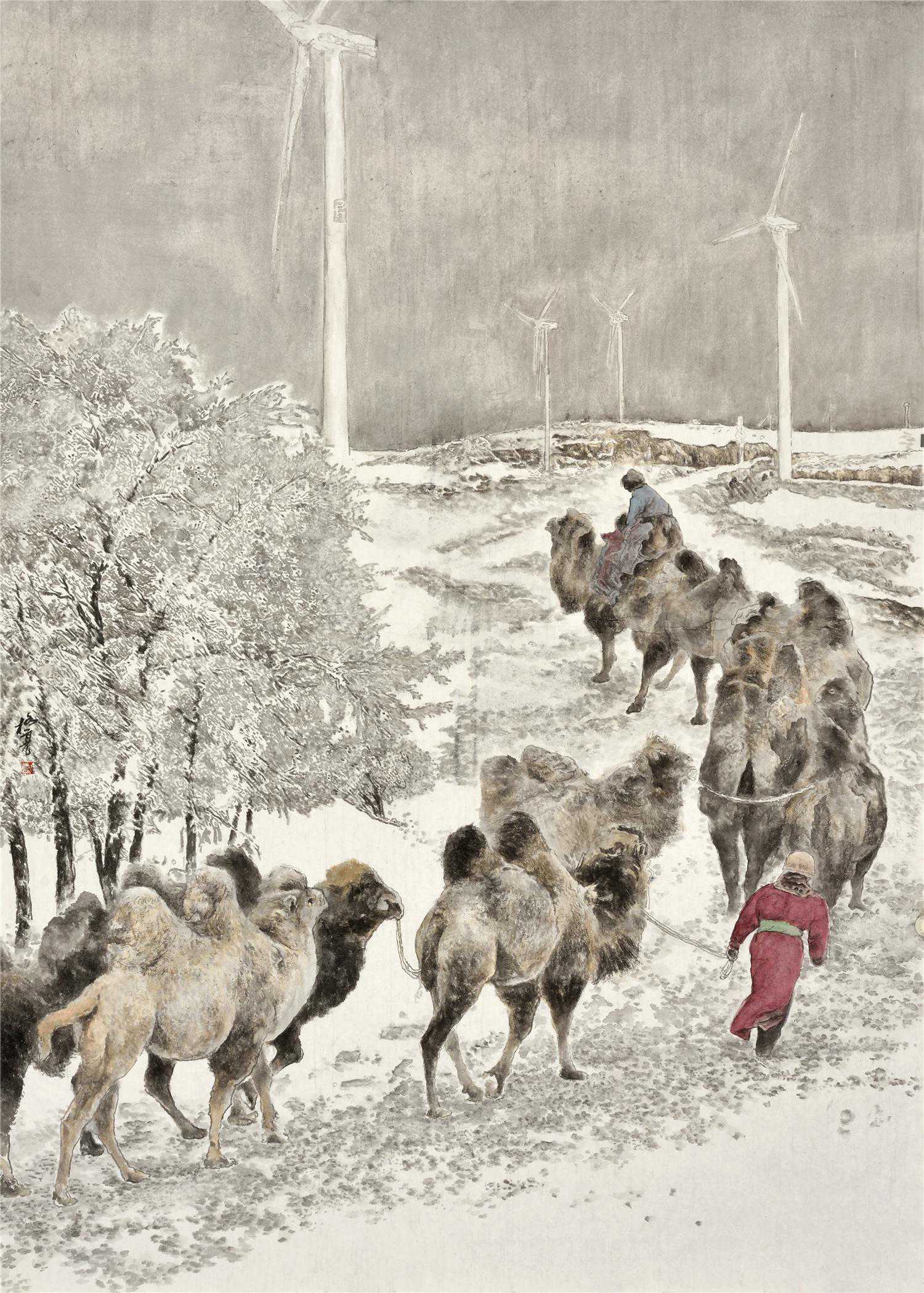 画面以黑白灰为基调,金银色为背景,红色武警的组合形成画面的主体色调。此幅作品入选《诗乡画城·潇洒桐庐》全国画展。