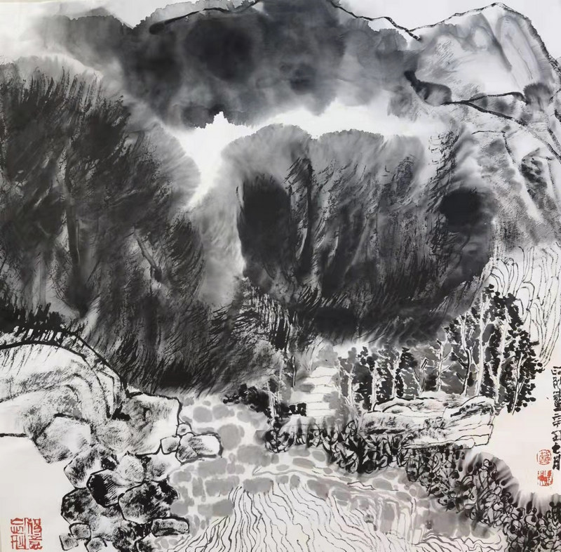 金石皴,破坏性构图、魏体焦墨,苏政勋这三种发明让人眼前一亮,他独创的金石皴可以说是建国以来傅抱石解索皴以后的又一新发明皴法,给他的画带来了革命性的亮点。,更重要的一点是,无论从他的大画或斗方中,我们都可以窥见其中缊藏的当代性,当代艺术对他画的深刻影响是不可忽略的。虽然他画的是中国画,但他对西方当代艺术的了解非常深刻,可以如数家珍地娓娓道来,很多观点当是十分新頴和深刻的。
