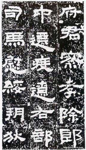 看《鲜于璜碑》很容易使人联想到《张迁碑》,这种通感大概是产生于这两块碑文的字形多呈方硬感的原因。但是,当人们细赏《鲜于璜碑》,就会发现,它还有着自己的强烈个性。《鲜于璜碑》笔画丰厚饱满,波法平整,横画的感觉略比竖粗。碑阳字多呈扁方,而碑阴字扁、长,方相交替出现,形态变化十分生动。加之有时重心高举,下方散开,有时重心低着,呈敦厚状,有时又重心偏倚,或左或右,动势出入微妙之间,妙趣横生。另外《鲜于璜碑》波挑也与众不同,许多横波肥厚而作扭锋上翘状,更增添了一种幽默感。